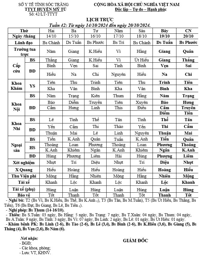 Lịch trực tuần 42 (Từ 14/10/2024 đến 20/10/2024)
